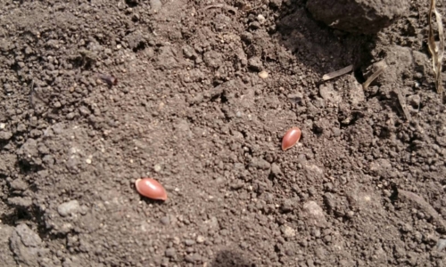 ゴマより少し大きく平たく、茶色で“ツヤツヤ”に成ります。又、9月の収穫時に~