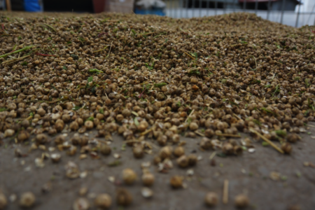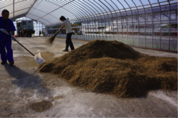 収穫した亜麻を、ハウス内で“地乾し”し、その後雑草の種等も混合なので、