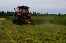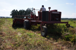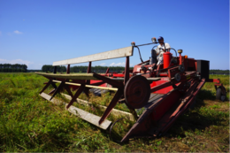 「ヘストン」を自作改良し、寝てしまった亜麻をコンバイン使用の後、刈っている所。