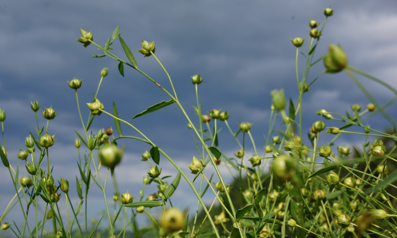 朝、開花を待つ姿と亜麻の実も成熟を待つ。