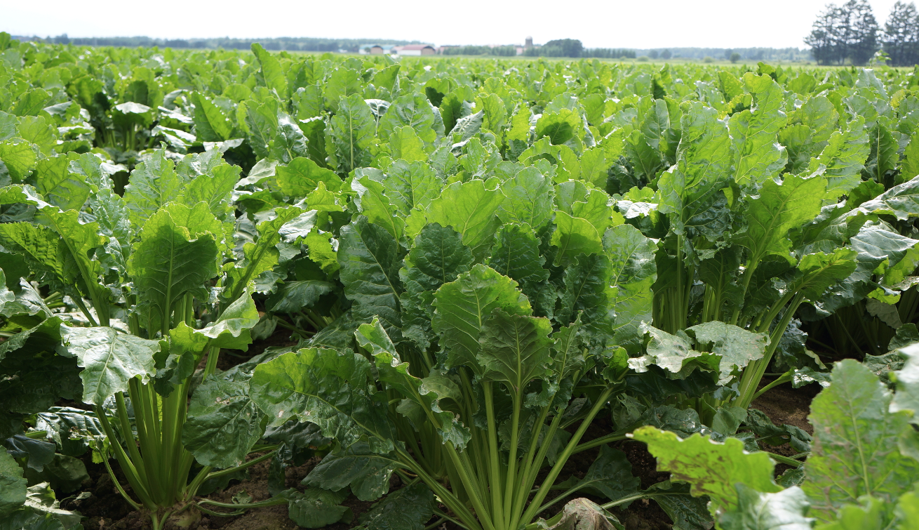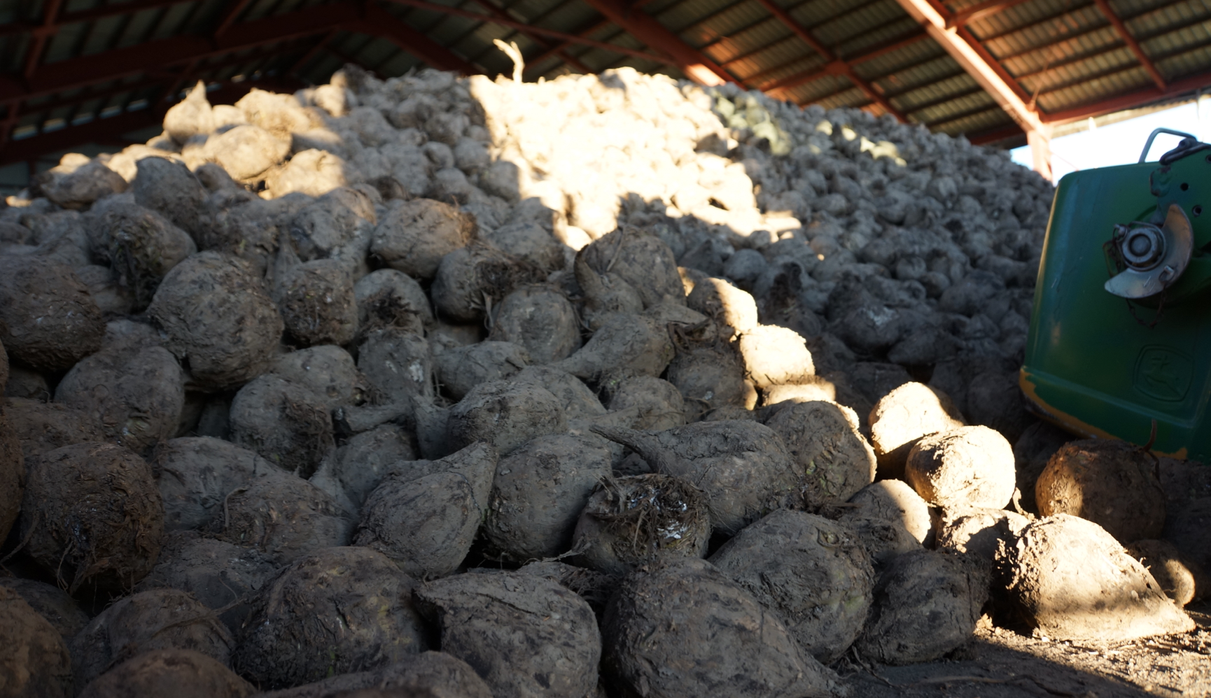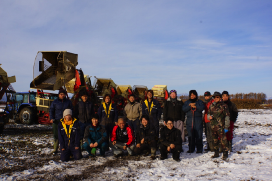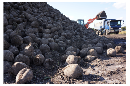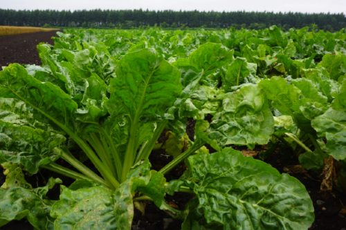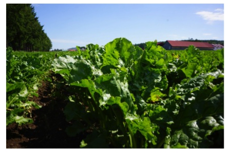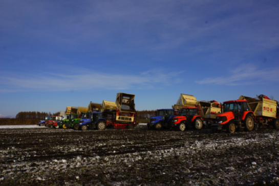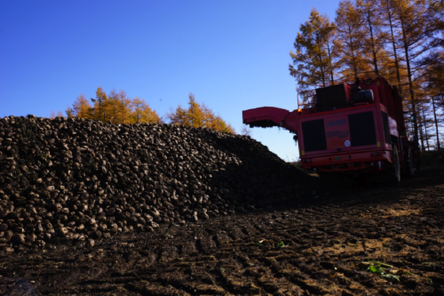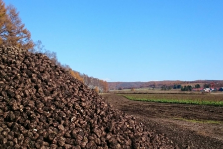 手前には、芽室の日甜製糖工場に大型トラックで運ばれる順番を待つ、