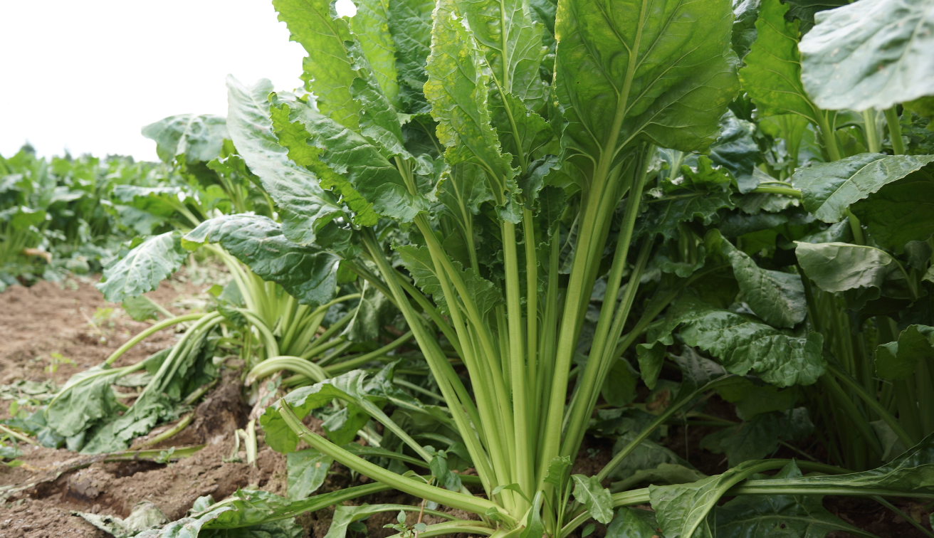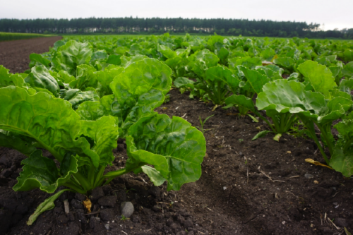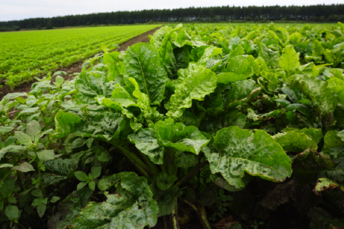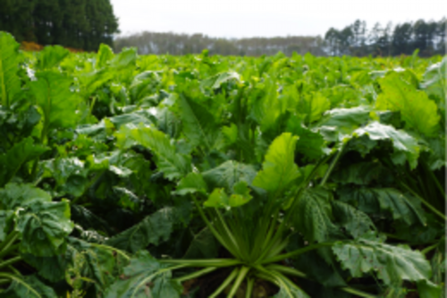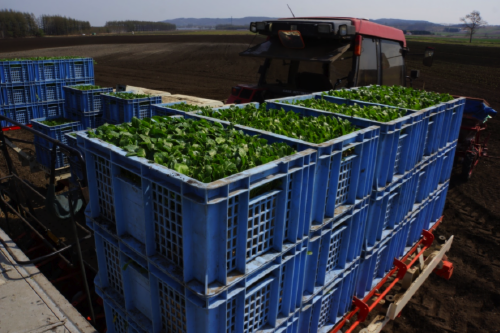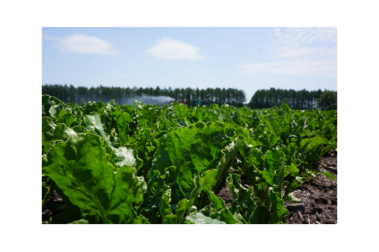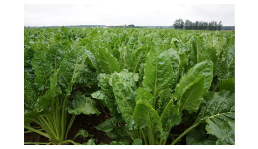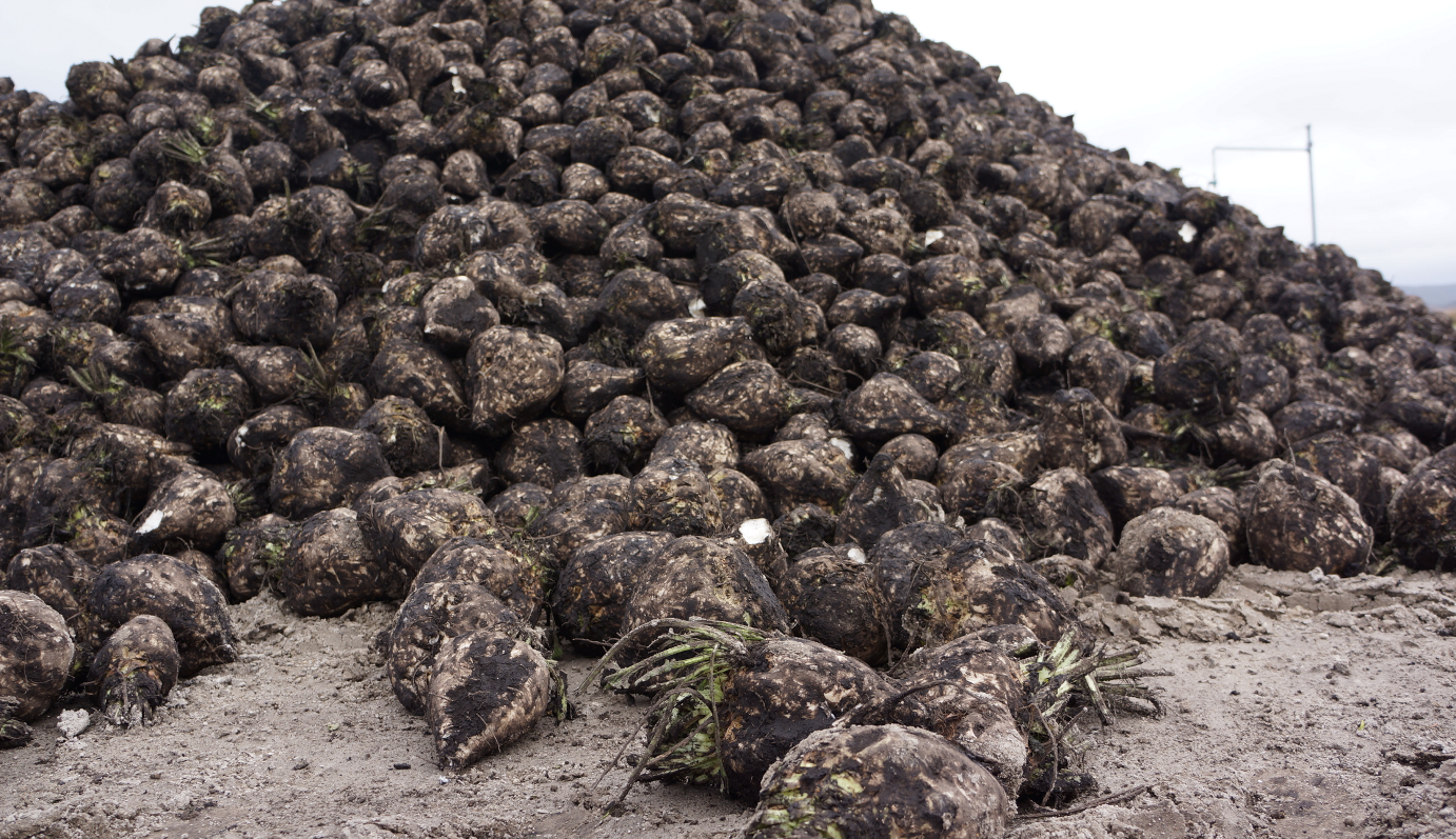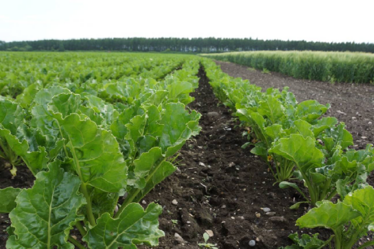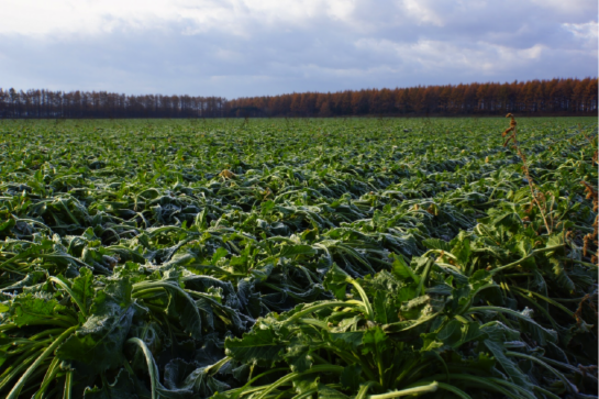 手前には、芽室の日甜製糖工場に大型トラックで運ばれる順番を待つ、