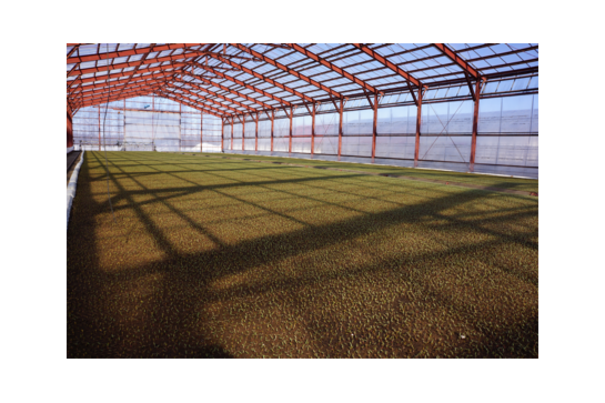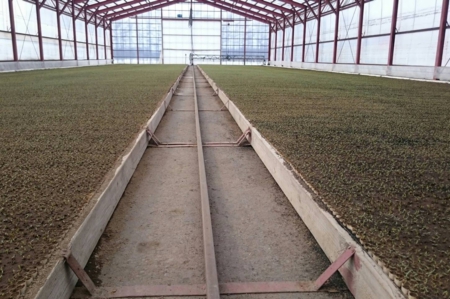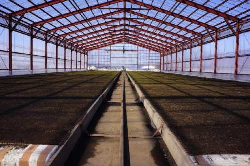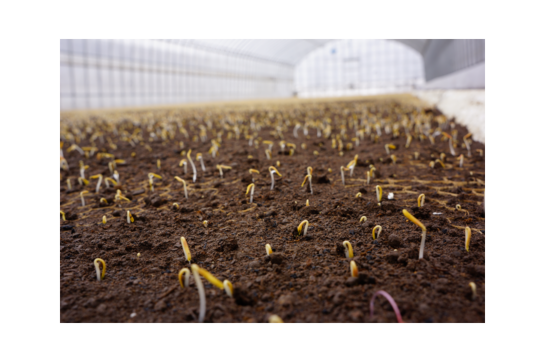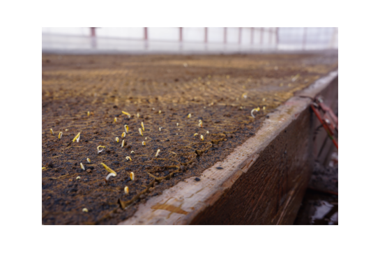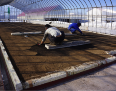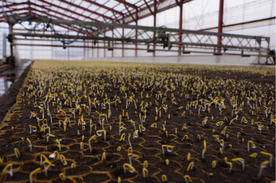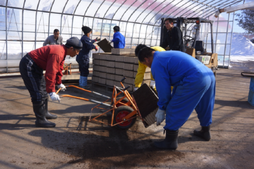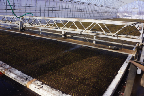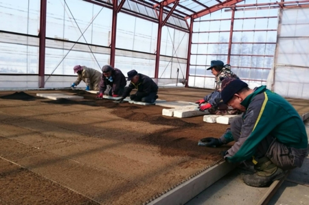 3月3日に種が入ったペーパーポットは、暖房のある大きなハウス内に。