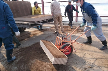 ビートの種と土が詰められた1800冊ものペーパーポットが搬入されました!