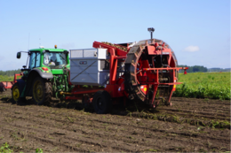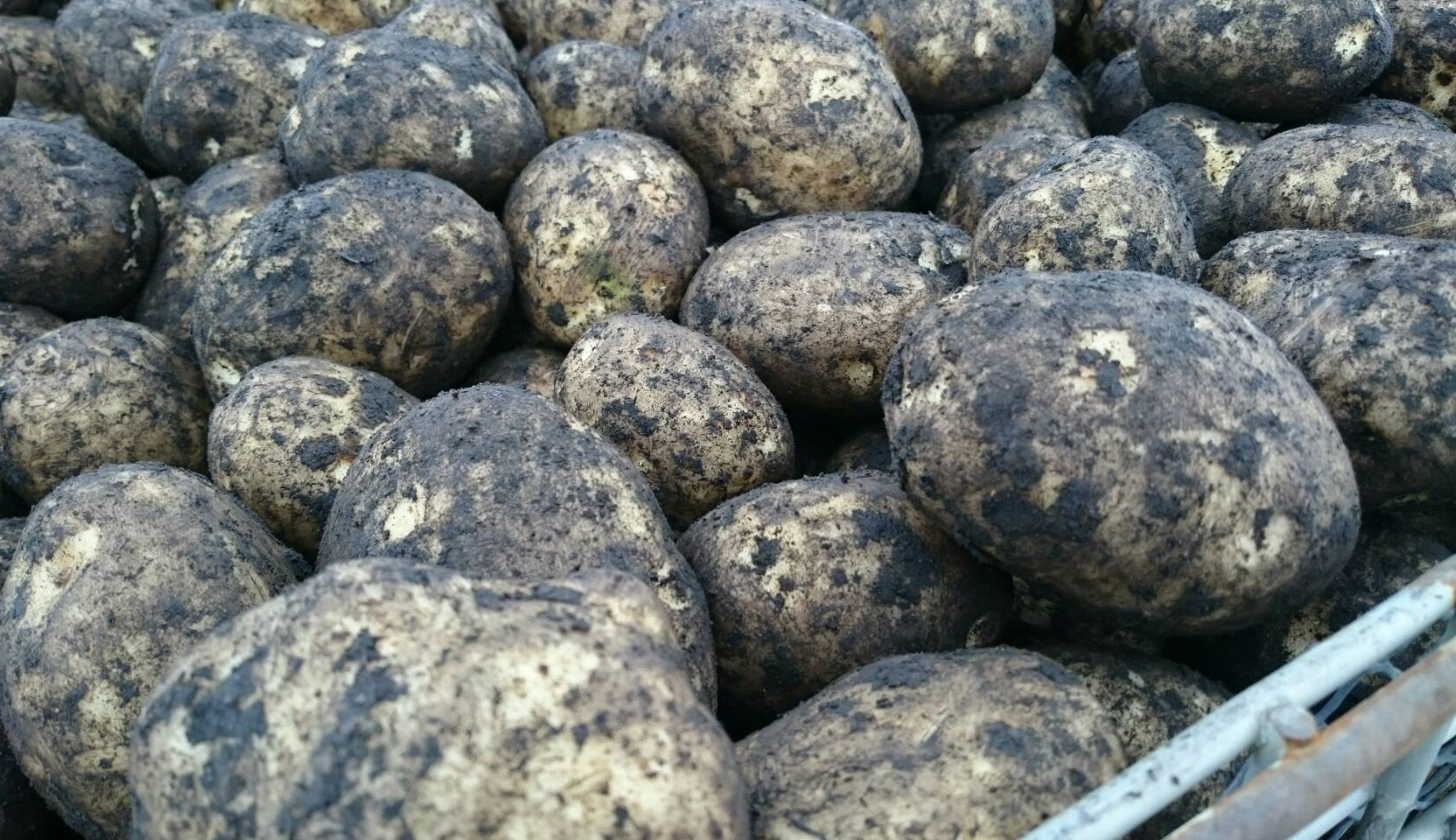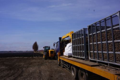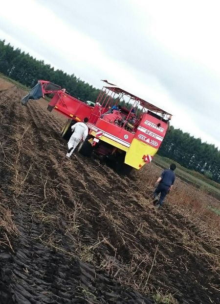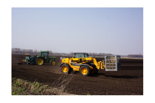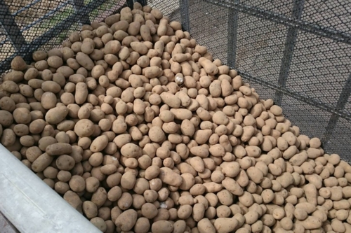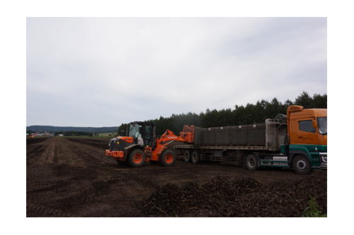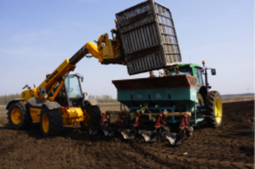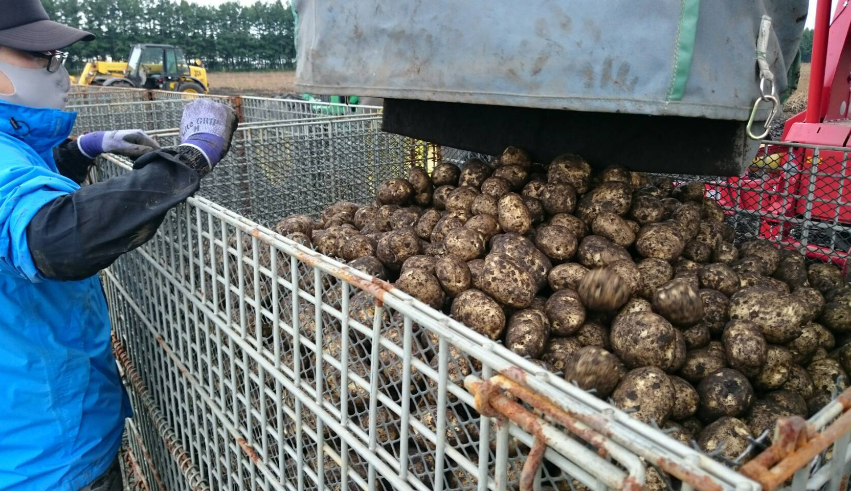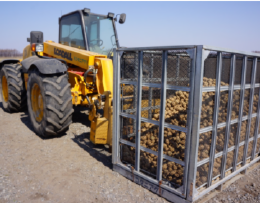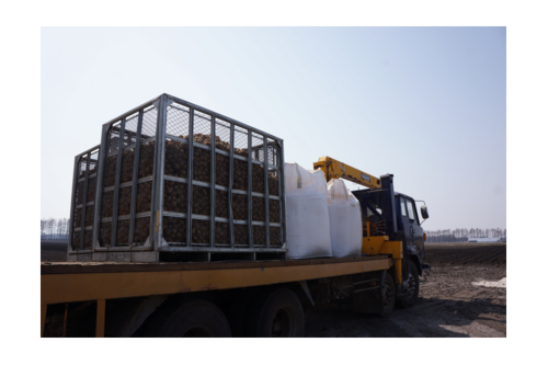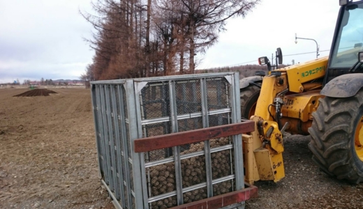 JCBの回転リフトで、1200㎏の種イモが入った大コンテナから